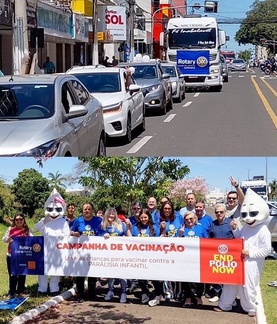 No último fim de semana os rotarianos promoveram a terceira carreata de alerta à população sobre a importância da vacinação. Desta vez as personagens do Zé e Maria Gotinha foram os destaques atraindo as crianças, e por consequência dos pais, ao movimento. “Foi impressionante à força que as personagens demonstraram”, disse em tom de surpresa o jornalista Márcio Cavalca Medeiros, associado ao Rotary Club de Marília-Pioneiro. “Eles personalizam o movimento que fica claro ser sobre a vacinação”, reforçou o policial militar Marcos Antônio Ribeiro Farto, presidente do Rotary Club de Marília-Coroados que vestiu uma das fantasias, enquanto que o rotariano Sidney Estevão do Nascimento, associado ao Rotary Club de Marília, vestiu a outra fantasia. “O brilho do olhar das crianças é algo fora do comum”, constatou o rotariano.