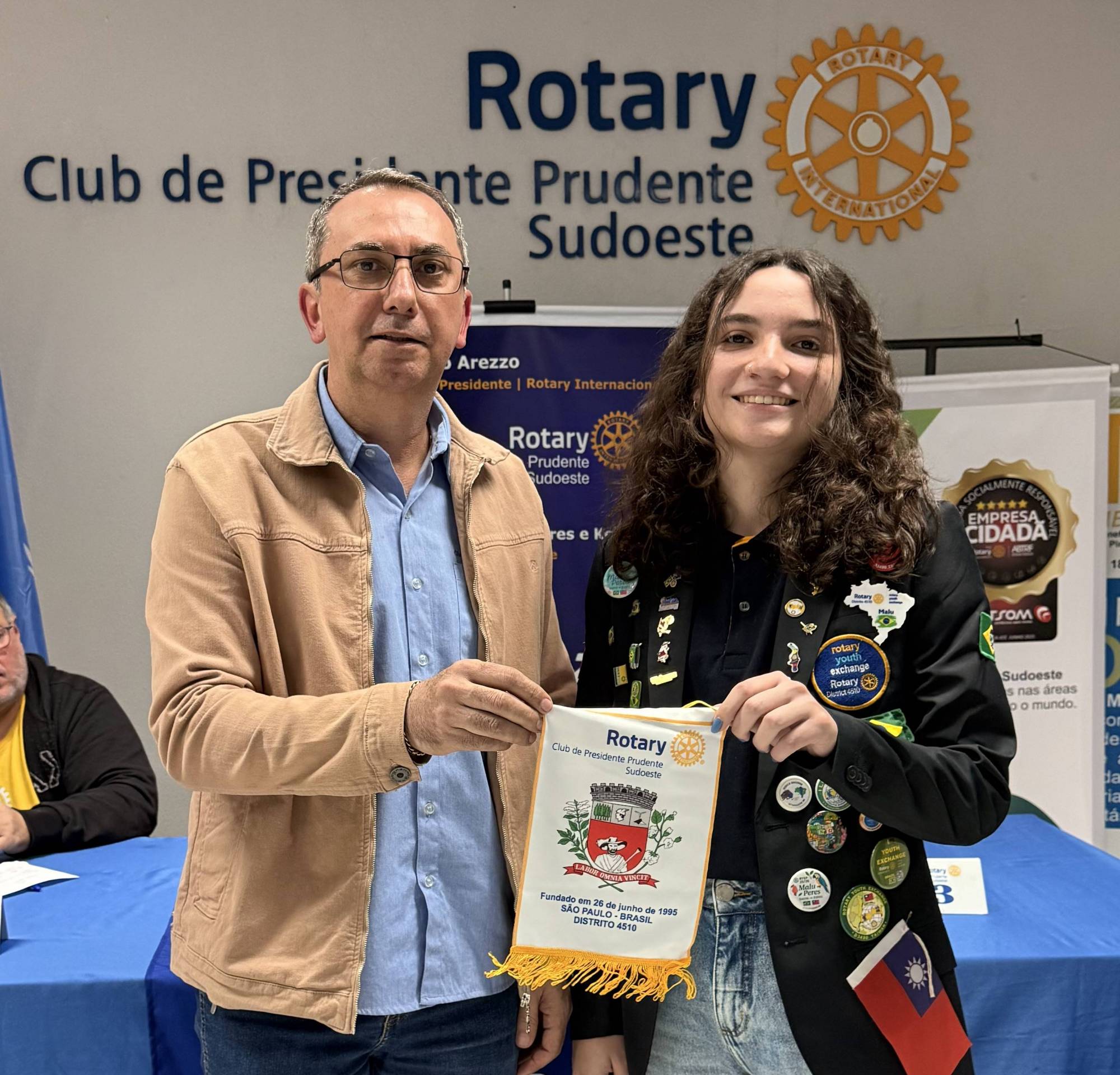 Durante a reunião, Malu ocupou a tribuna para compartilhar suas expectativas e emoções, demonstrando entusiasmo e gratidão pela oportunidade. Ela recebeu, das mãos do presidente Joel Viscaino Soares, as flâmulas do clube, que levará consigo para trocar com os clubes que visitar, representando o Rotary Sudoeste e a cidade de Presidente Prudente com orgulho.