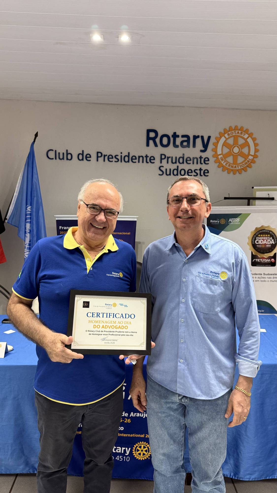 Na noite de segunda-feira, 25 de agosto de 2025, o Rotary Club de Presidente Prudente Sudoeste teve a honra de prestar uma homenagem especial ao companheiro Francisco Carlos Giroto, Governador Assistente do Distrito 4510 e advogado atuante, em celebração ao Mês do Advogado, comemorado nacionalmente em 11 de agosto.