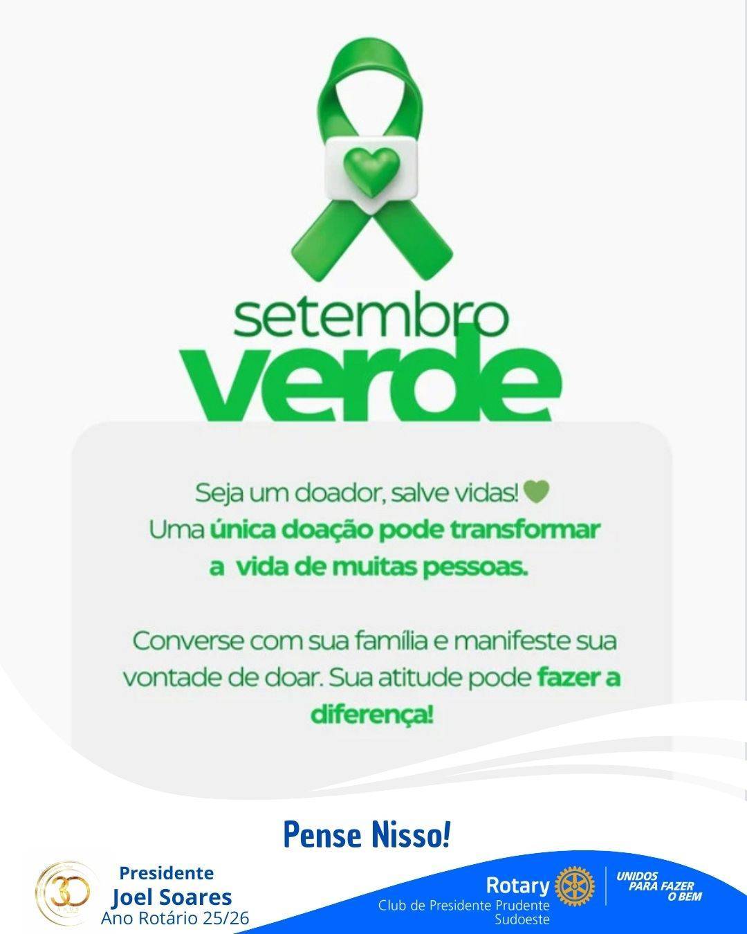 Neste Setembro Verde, o Rotary Club de Presidente Prudente Sudoeste convida todos a refletirem: você já falou com sua família sobre ser doador?