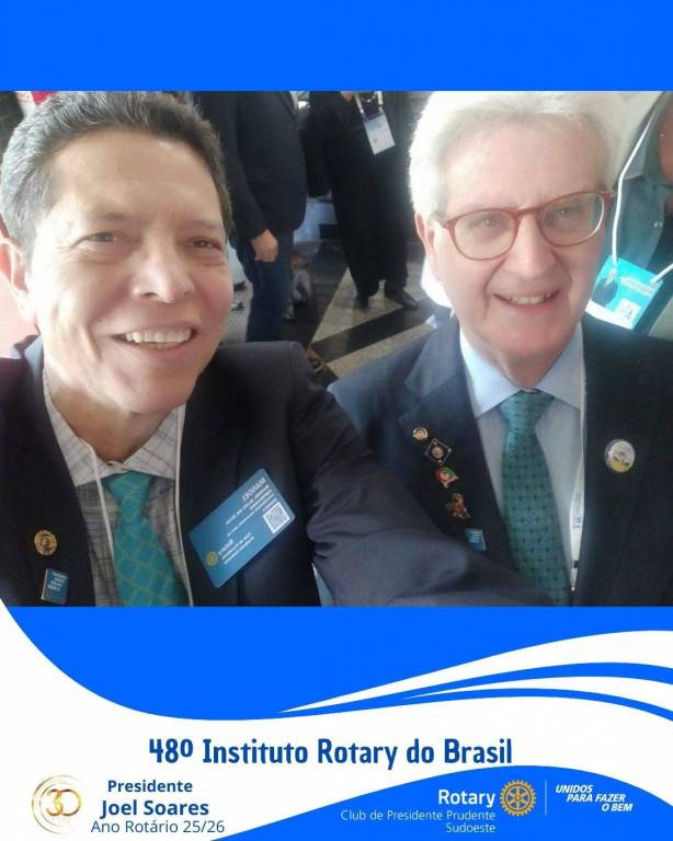 E para eternizar esse momento especial, o companheiro e governador assistente Manoel Alves, do Rotary Club de Presidente Prudente Sudoeste, registrou uma selfie histórica ao lado de Francesco Arezzo, simbolizando a proximidade, o prestígio e o espírito de união que o Instituto promove entre os líderes rotários.
