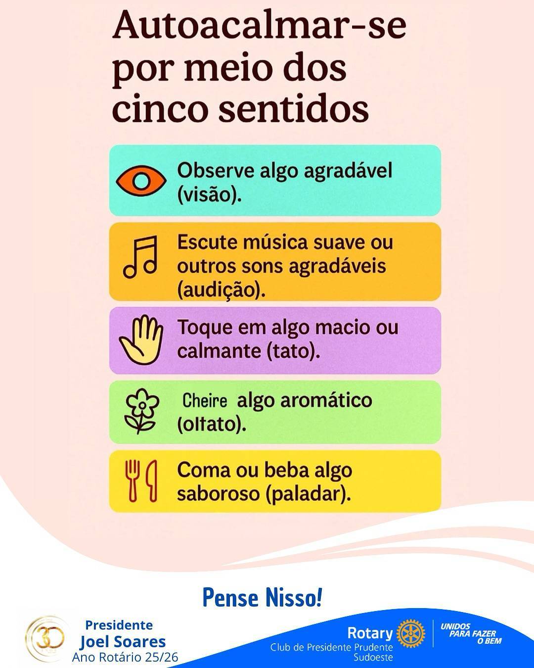 Em um mundo cada vez mais acelerado e exigente, aprender a lidar com o estresse e as emoções intensas tornou-se uma habilidade essencial para o bem-estar. Pensando nisso, o Rotary Club de Presidente Prudente Sudoeste compartilha uma prática acessível e poderosa: o autoacolhimento por meio dos cinco sentidos.