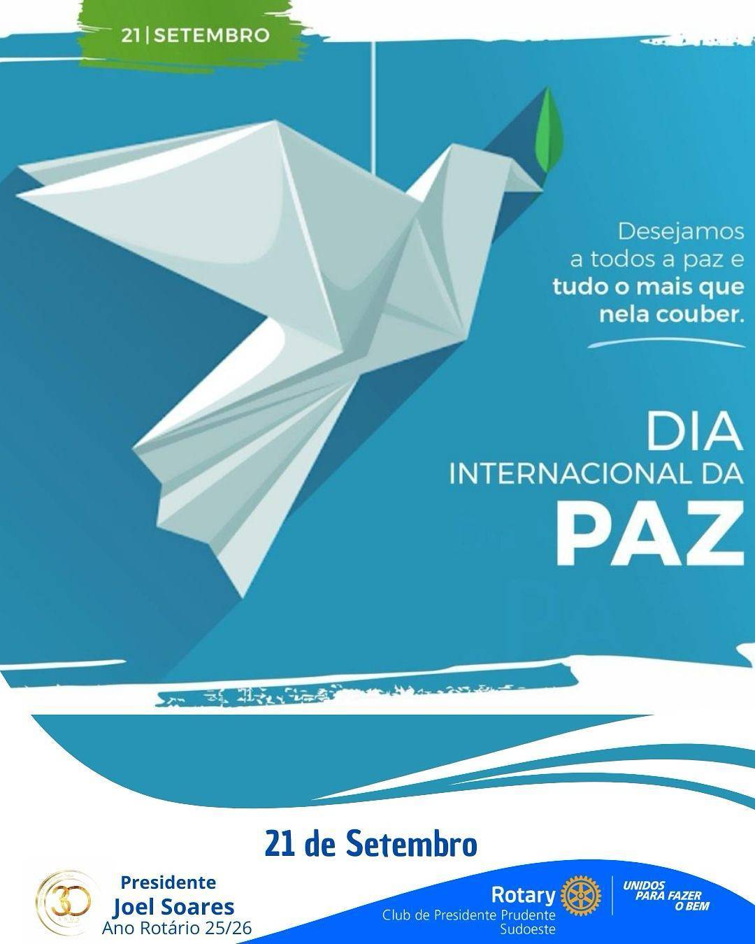 O Rotary Club de Presidente Prudente Sudoeste se une a essa celebração com o coração aberto e o compromisso renovado de servir para transformar vidas, promovendo a paz em cada gesto, projeto e palavra.