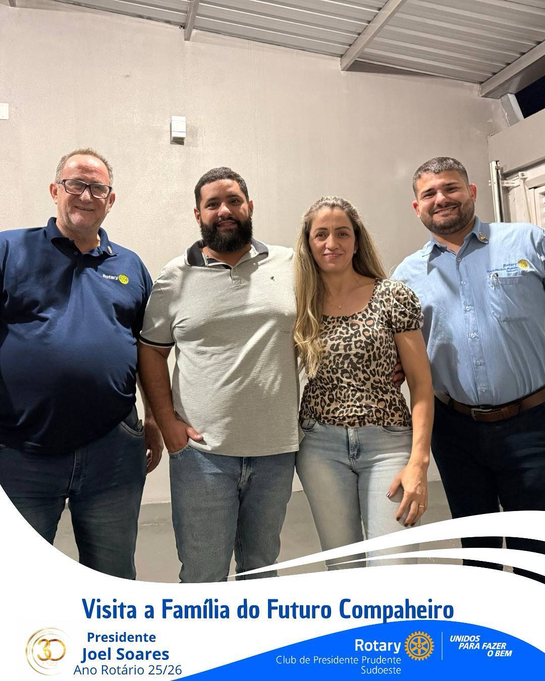 Na noite de 25 de setembro de 2025, o Rotary Club de Presidente Prudente Sudoeste realizou mais uma de suas tradicionais visitas familiares, desta vez na residência do futuro companheiro Heber José Paiva, que nos recebeu de braços abertos, com acolhimento e entusiasmo.