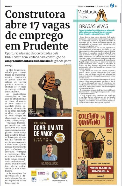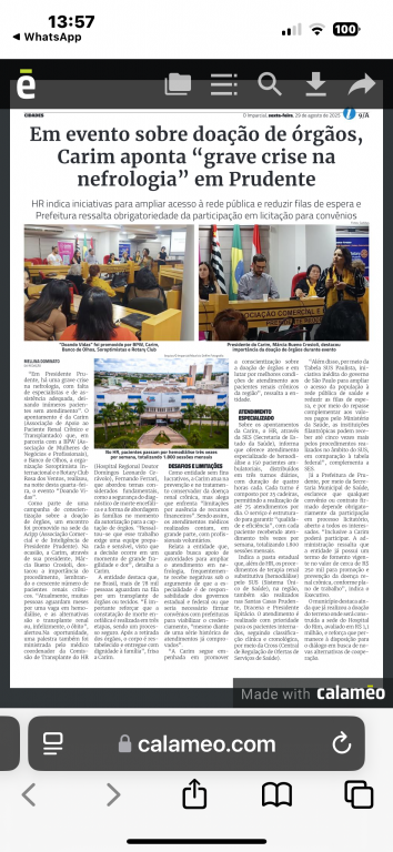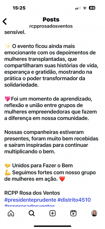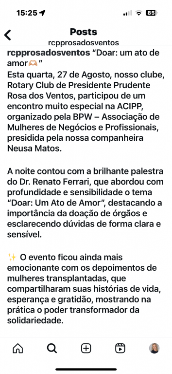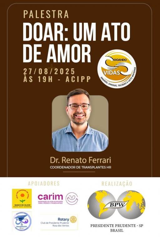 Dia 27-08-2025 Doar um Ato de Amor, Doação de órgãos , sangue, tecidos, leite materno, em parceria com,RCPP Rosa dos Ventos , BPW ( Associação de Mulheres de Negocios E Profissionais), Carim (Associação de Renais Cronicos), Banco d Olhos de Prudente, palestra do Dr Renato Ferrari Coordenador de transplante do hospital regional de Prudente, foi uma oportunidade de entender a importancia da doação de órgãos, sangue ,tecidos e leite materno, e esclarecendo dúvidas de forma clara e sensível gestos que salvam e transformam vidas. O vento ficou mais emocionante com os depoimentosdas pessoas transplantadas que compartilharam suas histórias, mostarndo na prática o poder transformador da solidariedade