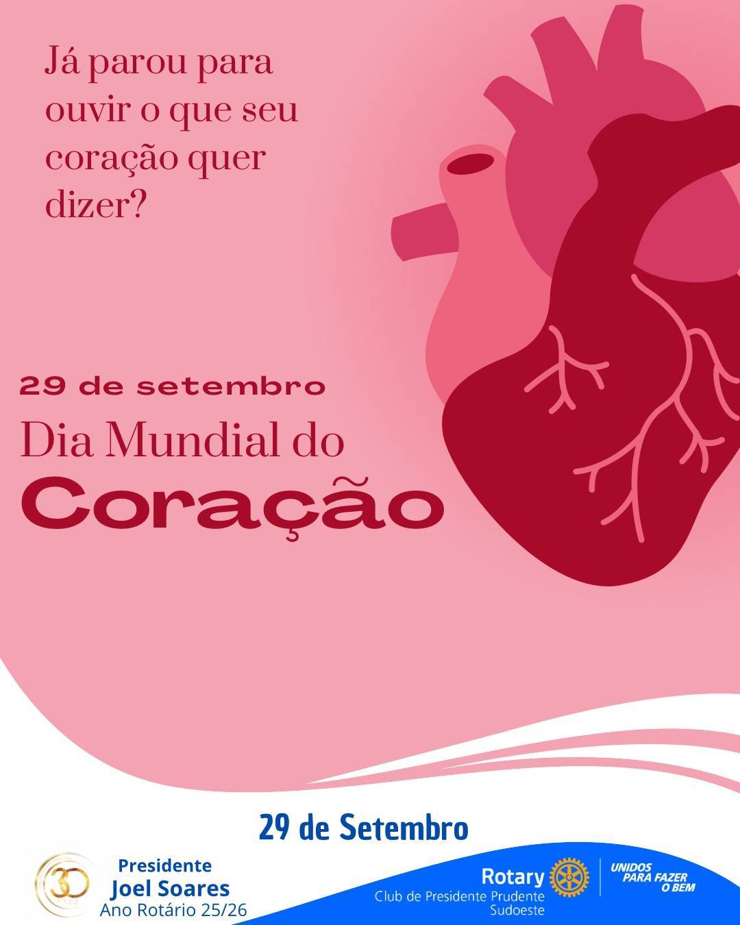No Rotary Club de Presidente Prudente Sudoeste, acreditamos que transformar vidas começa por cuidar daquilo que as mantém vivas. Neste 29 de setembro, data em que se celebra o Dia Mundial do Coração, reforçamos a importância da saúde cardiovascular como base para uma vida plena, ativa e consciente.