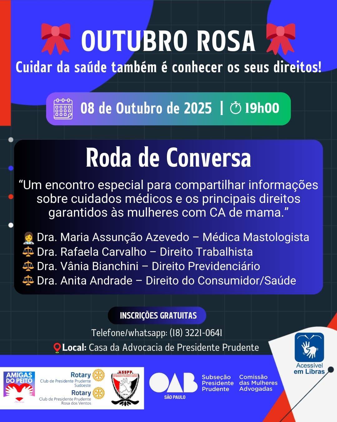 No próximo dia 08 de outubro de 2025, às 19h, a sede da OAB Presidente Prudente será palco de um encontro especial que une informação, empatia e cidadania: a Roda de Conversa “Saúde e Direitos da Mulher”, voltada à conscientização sobre o câncer de mama e os direitos garantidos às mulheres em tratamento.