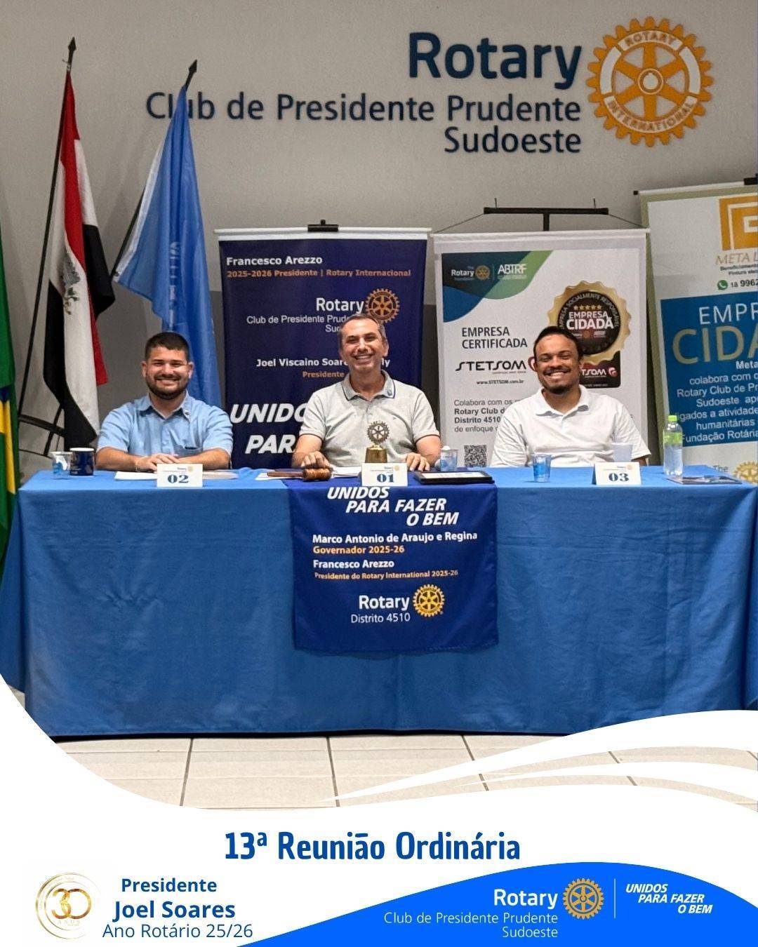 Na noite de 29 de setembro, o Rotary Club de Presidente Prudente Sudoeste realizou sua 13ª reunião ordinária do ano rotário 2025–26, sob a liderança do presidente Joel Viscaino Soares. O encontro foi marcado por momentos de acolhimento, reconhecimento e troca de experiências que fortalecem os laços rotários e comunitários.