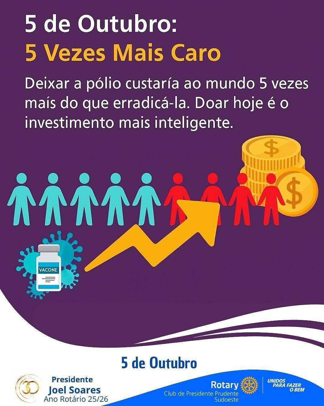 Neste 5 de outubro, o Rotary Club de Presidente Prudente Sudoeste reforça seu compromisso com a erradicação da poliomielite, uma das causas mais emblemáticas do Rotary International. A campanha “5 vezes mais caro” alerta para um dado contundente: deixar a pólio sem controle custaria ao mundo cinco vezes mais do que erradicá-la de forma definitiva.