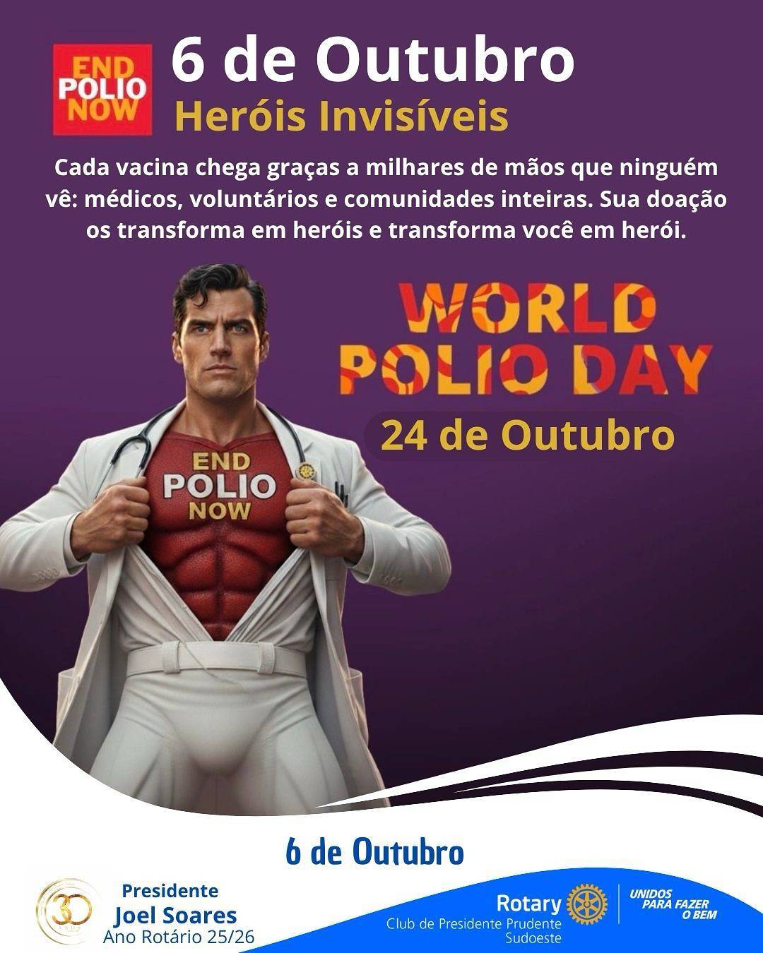 Neste 6 de outubro, o Rotary Club de Presidente Prudente Sudoeste se une à campanha nacional Heróis Invisíveis, que homenageia os milhares de profissionais, voluntários e comunidades que tornam possível a luta contra a poliomielite. Cada vacina aplicada é resultado de uma rede silenciosa de dedicação — e cada doação é um gesto que transforma vidas.