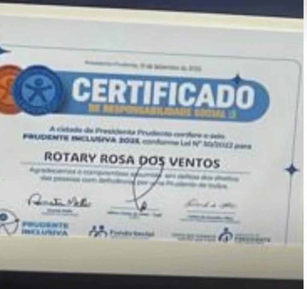 Dia 19-09-2025 na prefeitura de Presidenet Prudente , RCPP Rosa dos Ventos recebeu o Selo Prudente Inclusiva 2025 entregue pelo prefeito Milton Carlos de Mello- Tupã. Nosso Clube foi homenageado pela prefeitura de Prudente e pela Coordenadoria Municipal da Pessoa com Deficiência com o Certificado de Responsabilidade Social, em reconhecimento ao compromisso com a inclusão das pessoas com deficiência em nossa cidade. Esse selo reforça nosso prpósito de promover ações sociais que transformam vidas e constroem uma comunidade mais acessível, justa e acolhedora. Um marco importante para o nosso Clube que segue unido no propósito de servir e transformar vidas. Com a presença do deputado estadual Mauro Bragato e vários vereadores de Prudente.