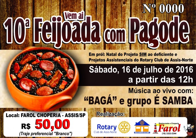 FOI UM SUCESSO A 10a. FEIJOADA COM PAGODE, realizada no Farol Choperia, no ultimo dia 16 de Julho/2016, onde contou com a presença de mais de 300 pessoas. A Animação foi da Banda "BAGA" e os musicos é o SAMBA! O repertorio inicio as 12 horas e foi até as 17 horas. Foram momentos de muito companheirismo e descontração. A renda liquida será revertida para a realização do NATAL DO SIM AO DEFICIENTE E DO 3.º ROTARY DAY ESPECIAL - INCLUSÃO SOCIAL da gestão 2016-17. Presidente Fernando Henrique da Rosa e esposa Ana Ferrari organizaram o evento, e o resultado foi magnifico. Cada participante recebeu um chapeu personalizado para o evento quando adentrava o recinto. A participação dos companheiros e senhoras da casa da amizade do Rotary Club de Assis-Norte nas vendas de convites e na realização do evento, fez com que o sucesso fosse alcançado. Parabéns ao presidente, e também ao proprietário da empresa Farol Choperia, e aos patrocinadores: Brahma; Ana Ferrari e Soraya Fadel.