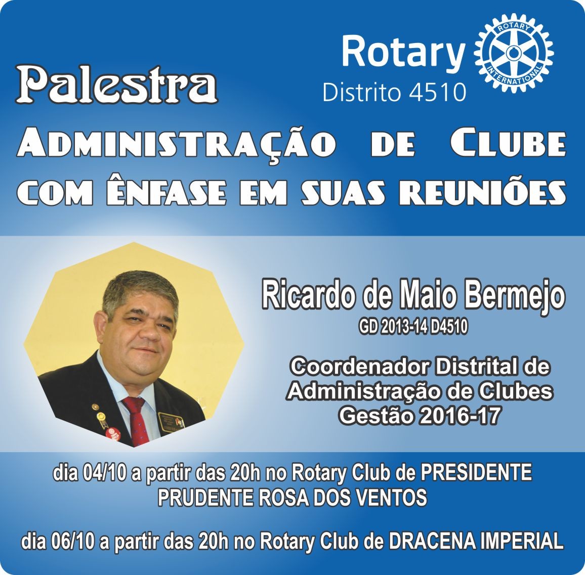 PALESTRA ADM. DE CLUBES COM ENFASE EM SUAS REUNIÕES PROFERIDA PELO GD 13-14, RICARDO DE MAIO BERMEJO NO ROTARY CLUB DE DRACENA-IMPERIAL - DIA 06/10/2016 ÀS 20H00 HORAS.