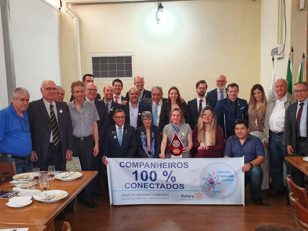 O momento foi registrado com a FOTO de exibição da faixa (banner) da campanha das metas do ano 2019-20, intitulada "COMPANHEIROS 100% CONECTADOS” da campanha “CONECTADO A FUNDAÇÃO ROTÁRIA”.