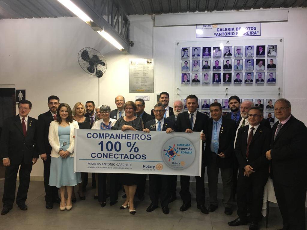 O momento foi registrado com a FOTO de exibição da faixa (banner) da campanha das metas do ano 2019-20, intitulada "COMPANHEIROS 100% CONECTADOS” da campanha “CONECTADO A FUNDAÇÃO ROTÁRIA”.