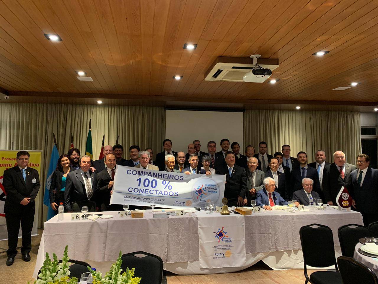 O momento foi registrado com a FOTO de exibição da faixa (banner) da campanha das metas do ano 2019-20, intitulada "COMPANHEIROS 100% CONECTADOS” da campanha “CONECTADO A FUNDAÇÃO ROTÁRIA”.