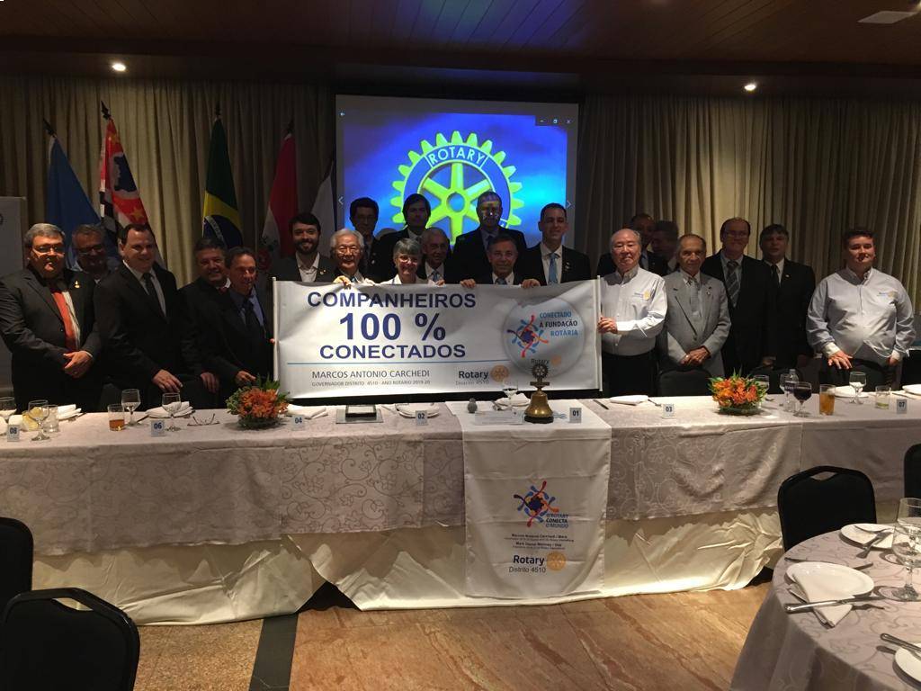 O momento foi registrado com a FOTO de exibição da faixa (banner) da campanha das metas do ano 2019-20, intitulada "COMPANHEIROS 100% CONECTADOS” da campanha “CONECTADO A FUNDAÇÃO ROTÁRIA”.