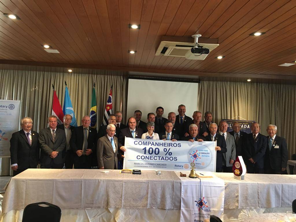 O momento foi registrado com a FOTO de exibição da faixa (banner) da campanha das metas do ano 2019-20, intitulada "COMPANHEIROS 100% CONECTADOS” da campanha “CONECTADO A FUNDAÇÃO ROTÁRIA”.